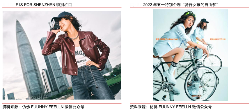 經(jīng)典案例:根據(jù)FUUNNY FEELLN微信公眾號、中信證券研究部等綜合資訊表明,F(xiàn)UUNNY FEELLN仿佛:融入深圳地域標(biāo)志,打造都市通勤標(biāo)簽,塑造酷颯女孩風(fēng)格。仿佛定位為中淑人群,聚焦未來女性的生活方式,主張把“新鮮的,趣味的設(shè)計元素”融入日常通勤時裝。2022 年推出 F IS FOR SHENZHEN 特別欄目,探尋深圳城市文化、仿佛品牌以及當(dāng)代酷颯女孩的共鳴與連接,傳遞“獨立、現(xiàn)代、自由、夢想”的品牌精神。