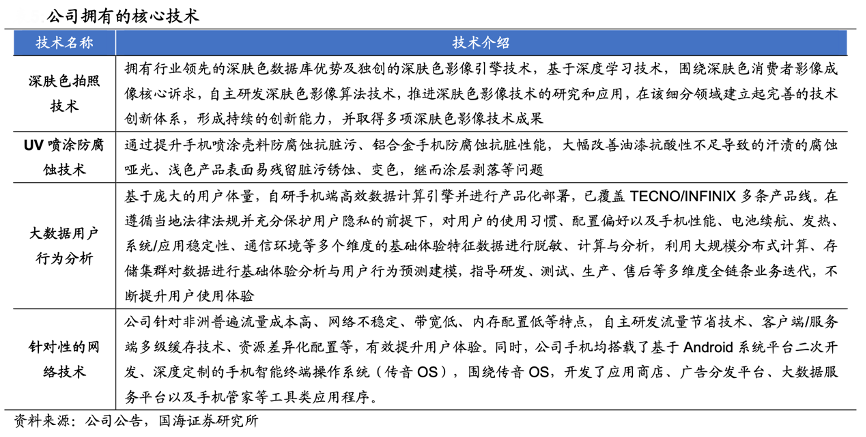 經(jīng)典案例:根據(jù)公司公告、國海證券研究所等綜合資訊表明,近年來,傳音公司加速研發(fā)布局,通過識別技術(shù)的創(chuàng)新變革點(diǎn),構(gòu)筑“用戶和技術(shù)雙驅(qū)動”的產(chǎn)品體系與能力;深耕本地化創(chuàng)新,不斷強(qiáng)化自身在深膚色影像技術(shù)平臺、新材料創(chuàng)新應(yīng)用等本地化創(chuàng)新領(lǐng)域的優(yōu)勢地位,并持續(xù)加大在人工智能、大數(shù)據(jù)算法、智能認(rèn)知 AI 語音、AIoT垂直應(yīng)用技術(shù)架構(gòu)、5G等技術(shù)科研項(xiàng)目的投入,推進(jìn)基礎(chǔ)研究、技術(shù)研發(fā)和產(chǎn)品開發(fā)三級研發(fā)體系升級。
