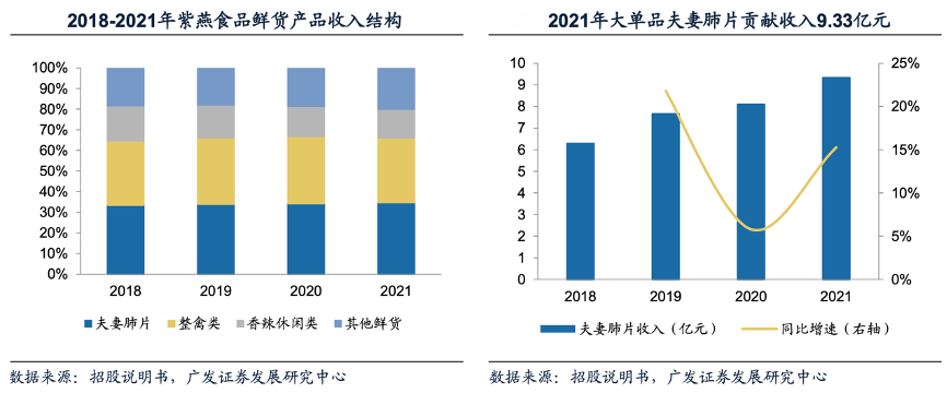 經(jīng)典案例:根據(jù)招股說(shuō)明書、廣發(fā)證券發(fā)展研究中心等綜合資訊表明,紫燕食品鮮貨類產(chǎn)品主要包括夫妻肺片、整禽類、香辣休閑類和其他,前三大單品分別為夫妻肺片、百味雞和藤椒雞。其中的“夫妻肺片”是公司最具代表性的大單品,精選優(yōu)質(zhì)牛肉、牛肚、豬 耳等十多種原料煮制,加入紅油調(diào)味,并由終端門店店員根據(jù)顧客個(gè)性化需要現(xiàn)拌稱重。2018-2021年夫妻肺片收入規(guī)模由6.28億元增長(zhǎng)至9.33億元,收入復(fù)合增長(zhǎng) 14.09%。