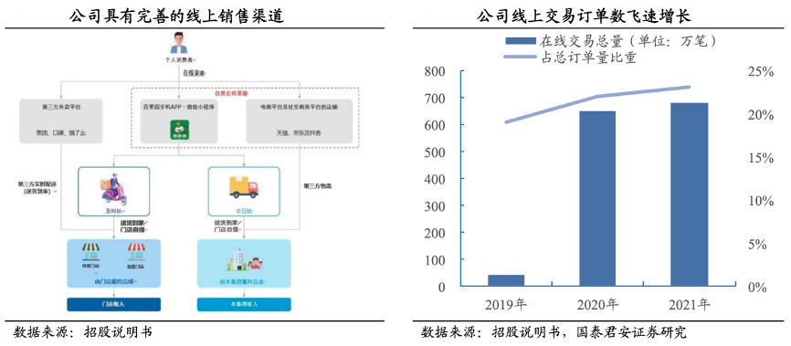 經(jīng)典案例:根據(jù)招股說明書、國泰君安證券研究等綜合資訊表明,百果園實行“店倉一體化”戰(zhàn)略,不斷增加客戶粘性。水果是在陳列和面銷環(huán)節(jié)附加值最高的大生鮮品類之一,通過店內(nèi)展示、面銷及試吃活 動,打造強烈的水果零售氛圍、刺激消費;并為選擇送貨到家或到店自提服務(wù)的客戶提供差異化產(chǎn)品,以有效提升購買頻次和對社區(qū)消費者的覆蓋面;同時通過社群營銷、拼團等促銷活動,鼓勵消費者在線上下單及到店自提,以提升交叉銷售。