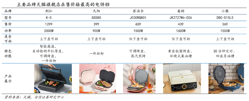 經(jīng)典案例:根據(jù)天貓、安信證券研究中心等綜合資訊表明,利仁公司產(chǎn)品在高端市場(chǎng)具有領(lǐng)先地位,和其他品牌的電餅鐺形成差異化競(jìng)爭(zhēng)。K-5 為公司線上在售煎烤機(jī)最貴的型號(hào),除了產(chǎn)品功能及智能化程度較高外,該產(chǎn)品的價(jià)格遠(yuǎn)高于其它主要品牌的最貴型號(hào)。利仁通過(guò)差異化的高端產(chǎn)品,打開(kāi)了行業(yè)煎烤機(jī)的價(jià)格天花板,和其它品牌展開(kāi)錯(cuò)位競(jìng)爭(zhēng)。
