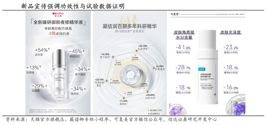 經(jīng)典案例:從天貓官方旗艦店、薇諾娜專柜小程序、可復(fù)美官方微信公眾號(hào)、信達(dá)證券研究開發(fā)中心等綜合資訊表明,國(guó)貨品牌強(qiáng)調(diào)對(duì)于原料或成分的宣傳,品牌在產(chǎn)品命名時(shí)已經(jīng)將核心成分作為宣傳點(diǎn),如:薇諾娜的“多元肽”緊致精華液、“乳糖酸”清痘精華液,潤(rùn)百顏的新肌煥活“纖連蛋白”次拋玻尿酸精華液,可麗金的“重組膠原蛋白”賦能珍萃緊致抗皺面霜,通過在產(chǎn)品名稱中加入核心成分名稱直接點(diǎn)明產(chǎn)品與競(jìng)品間的差異點(diǎn)。同時(shí),產(chǎn)品“試驗(yàn)數(shù)據(jù)”成為重要宣傳點(diǎn)。