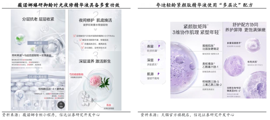 經(jīng)典案例:根據(jù)天貓官方旗艦店、薇諾娜專柜小程序、信達(dá)證券研究開發(fā)中心等綜合資訊表明,以薇諾娜臻研御齡時(shí)光夜修精華液與夸迪 5D 玻尿酸輕齡緊顏肽精華液為例,兩個(gè)精華產(chǎn)品以不同成分對(duì)應(yīng)不同皮膚層次的修護(hù),對(duì)于表皮層,薇諾娜該款精華液使用專研的青刺果油+馬齒莧提取物與依克多因,夸迪該款精華選擇乳酸桿菌發(fā)酵物(微美態(tài) ME-2)與依克多因,對(duì)于皮膚更深層次,兩款精華均選用肽類成分,成分復(fù)配帶來的多重功效性或?yàn)閲?guó)貨產(chǎn)品進(jìn)一步布局中高端市場(chǎng)提升競(jìng)爭(zhēng)力。