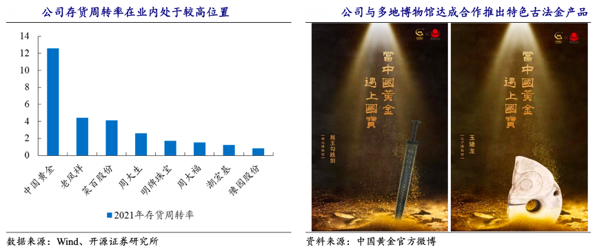 經(jīng)典案例:根據(jù)wind、中國黃金官方微博、開源證券研究所等綜合資訊表明,中國黃金公司作為國字號(hào)黃金珠寶品牌,金條產(chǎn)品深受消費(fèi)者信賴,而隨著公司回購業(yè)務(wù)布局繼續(xù) 推進(jìn),有望與黃金業(yè)務(wù)規(guī)模增長形成共振。財(cái)務(wù)表現(xiàn)方面,公司存貨周轉(zhuǎn)率明顯高 于其他龍頭珠寶品牌,主要由于公司金條營收占比高,且在央企信譽(yù)背書、標(biāo)準(zhǔn)金 錠回收資質(zhì)加持下,公司金條產(chǎn)品更受市場(chǎng)認(rèn)可。金飾產(chǎn)品方面,公司發(fā)揮央企的 資源優(yōu)勢(shì),與故宮等國家單位達(dá)成合作,創(chuàng)新推出故宮金等古法金產(chǎn)品,迎合當(dāng)下 年輕客群的國潮消費(fèi)趨勢(shì),提振金飾銷售表現(xiàn)。