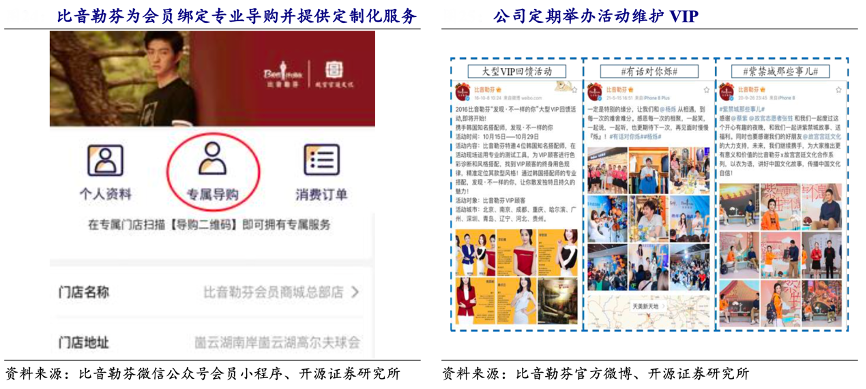 經(jīng)典案例:根據(jù)比音勒芬微信公眾號會員小程序、比音勒芬官方微博、開源證券研究所等綜合資訊表明,比音勒芬為會員綁定專業(yè)導(dǎo)購并提供定制化服務(wù),在消費(fèi)后店員會記錄該顧客的衣服尺碼及偏好,并定期根據(jù)顧客需求通過微信定向更新新款產(chǎn)品信息。顧客可以選擇到店或者在家試穿,門店可直接將新品快遞到家完成遠(yuǎn)程交易。同時,公司十分關(guān)注 VIP 的需求并定期維護(hù),如定期邀請 VIP 進(jìn)店、生日回訪、贈送禮品或邀請 VIP 成為首批新品體驗官等,增加 VIP 品牌粘性。