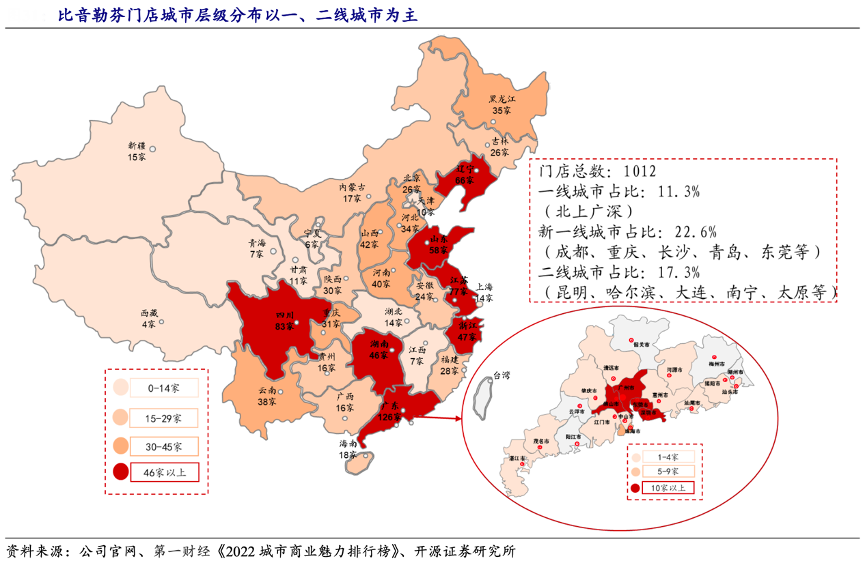 經(jīng)典案例:根據(jù)公司官網(wǎng)、第一財經(jīng)《2022城市商業(yè)魅力排行榜》、開源證券研究所等綜合資訊表明,結(jié)合官網(wǎng)的門店數(shù)據(jù),目前一線(北上 廣深)、新一線、二線城市的門店數(shù)量占比分別為 11.3%/23.1%/17.3%,門店主要位于高端商場、高鐵機(jī)場、奧特萊斯等。而三線以下城市門店占比為48.3%。