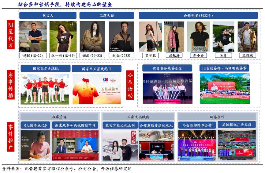 經(jīng)典案例:根據(jù)比音勒芬官方微信公眾號、公司公告、開源證券研究所等綜合資訊表明,比音勒芬從2013年開始成為中國國家高爾夫球隊(duì)合 作伙伴,助力雅加達(dá)亞運(yùn)會、悉尼高爾夫世界杯、東京奧運(yùn)會等,為國家隊(duì)打造專屬比賽服,如東京奧運(yùn)會的第二代奧運(yùn)比賽服——五星戰(zhàn)袍II,借勢奧運(yùn)營銷,強(qiáng)化品牌高爾夫文化,大國品牌形象凸顯。