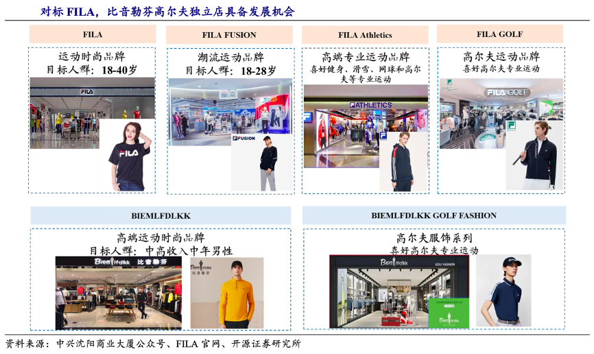 經(jīng)典案例:根據(jù)中興沈陽商業(yè)大廈公眾號、FILA官網(wǎng)、開源證券研究所等綜合資訊表明,在新韓國設(shè)計(jì)師主導(dǎo)下,比音勒芬公司在 2022 年將高爾夫系列進(jìn)行獨(dú)立開店,在部分高爾夫系列占比高的門店進(jìn)行試點(diǎn)。高爾夫系列細(xì)分為時(shí) 尚高爾夫和專業(yè)高爾夫兩大系列,定位高端時(shí)尚運(yùn)動(dòng),通過單獨(dú)開店進(jìn)一步提升高 端人群對于時(shí)尚運(yùn)動(dòng)的消費(fèi)體驗(yàn)。