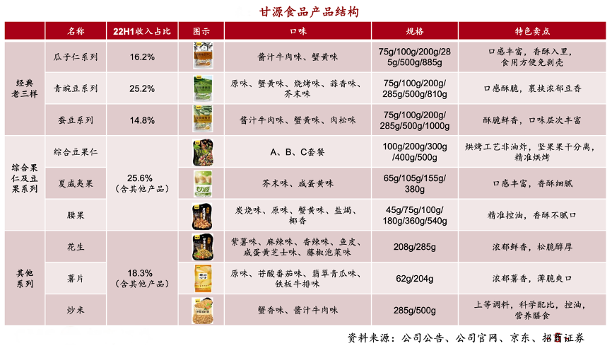 經(jīng)典案例:根據(jù)公司公告、公司官網(wǎng)、京東和招商證券等綜合資訊表明,甘源食品公司產(chǎn)品主要包含老三樣(瓜子仁、青豌豆、蠶豆系列)、綜合果仁及豆果系列、其他(花生、玉米、麥片等),其中經(jīng)典老三樣22H1占比約為56%,但增速相對放緩。21年公司開始加大新品開發(fā)推廣,夏威夷果仁、花生、豆果、米餅等新品市場反饋不錯(cuò),綜合果仁及豆果系列和其他系列占比持續(xù)提升,22H1分別占比 26%、18%。
