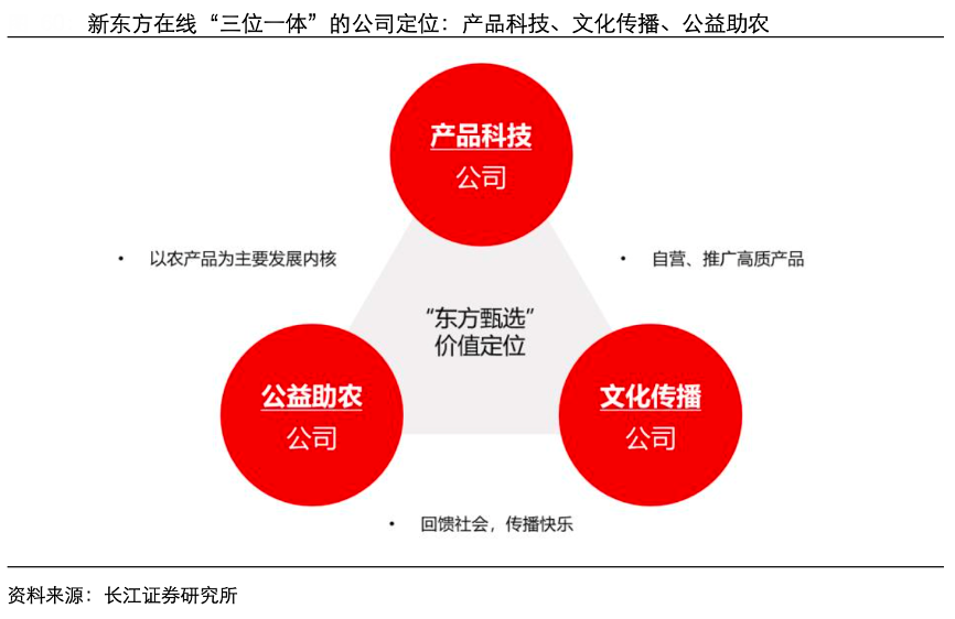 經(jīng)典案例:根據(jù)長江證券研究所等綜合資訊表明,從東方甄選管理層最近公開表述的公司定位中可以發(fā)現(xiàn),“產(chǎn)品與科技公司—文化傳播公司—公益助農(nóng)公司”三位一體,深化品牌內(nèi)涵被放在了戰(zhàn)略級高度。