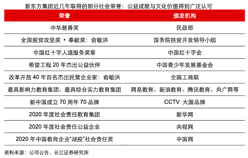經(jīng)典案例:根據(jù)公司公告、長江證券研究所等綜合資訊表明,自 1993 年北京新東方學(xué)校成立,其品牌已步入第30 年,始終致力于“努力成長為中國優(yōu) 秀的、令人尊敬的、有文化價值的教育機(jī)構(gòu)”;尤其在“雙減”考驗后,其在教育、公益方面的表現(xiàn)獲得了廣泛認(rèn)可,獲得多項國家部委、社會組織、社會媒體的榮譽(yù)獎項。