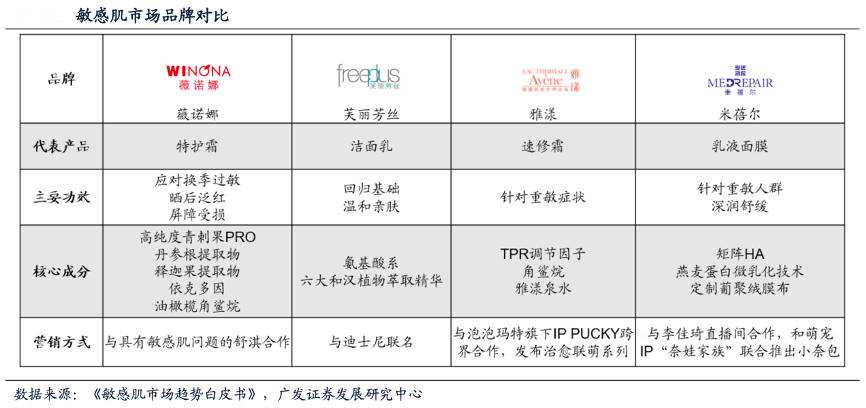 經(jīng)典案例:根據(jù)《敏感肌市場趨勢白皮書》、廣發(fā)證券發(fā)展研究中心等綜合資訊表明,2021年淘系敏感肌消費人群已達(dá)到千萬量級, 以二三線城市中青年女性為主力,整體消費能力和消費意愿較強(qiáng),整體仍處于高速 增長狀態(tài)。敏感肌市場主要品牌有薇諾娜、芙麗芳絲、雅漾、米蓓爾等,其中薇諾娜 科學(xué)萃取植物活性成分,針對敏感肌研發(fā)特護(hù)霜、修護(hù)精華、凍干面膜、敏肌專用防 曬等全套敏感肌專用產(chǎn)品系列;雅漾新品“速修霜”針對重度敏感人群主打快速降敏、修護(hù)、 減少反復(fù)等特點,入選天貓TOP100春季新品。