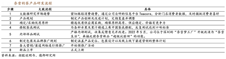 經(jīng)典案例:根據(jù)招股說明書、德邦研究所等綜合資訊表明,奈雪的茶將“上新”流程標(biāo)準(zhǔn)化,以研發(fā)團(tuán)隊(duì)為核心,聯(lián)合市場(chǎng)、營(yíng)銷、采購(gòu)等多部門協(xié)同合作,提高新品上市成功率的同時(shí),也確保新品變爆款后量產(chǎn)的貨源穩(wěn)定性,以及單品延展至系列產(chǎn)品的可持續(xù)性開發(fā)。
