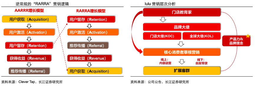 經(jīng)典案例:根據(jù)Clever Tap、公司公告、長(zhǎng)江證券研究所等綜合資訊表明,“門店教育家”是 lululemon 的獲客起點(diǎn),其招募來(lái)的門店大使(主 要是瑜伽、健身教練)以其在垂直領(lǐng)域的影響力天然影響學(xué)員購(gòu)買 lulu 的產(chǎn)品,學(xué)員及 粉絲(高粘性客群)因產(chǎn)品本身的功能性、舒適度與時(shí)尚度,及其傳達(dá)的生活理念自發(fā) 拓展到其社交圈層,以此帶來(lái) lulu 客戶群的進(jìn)一步擴(kuò)大。