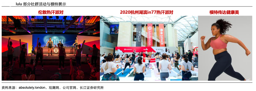 經(jīng)典案例:根據(jù)absolutely.london、觀潮網(wǎng)、公司官網(wǎng)、長(zhǎng)江證券研究所等綜合資訊表明,lululemon不定期舉辦社群活動(dòng),包含店內(nèi)和店外兩種形式,此外還自 2011 年起持續(xù)贊助溫哥華每年舉辦的 SeaWheeze 半程馬拉松比賽。線下舉辦開(kāi)放式瑜伽課程、熱汗派對(duì)等熱汗活動(dòng),線上開(kāi)設(shè)免費(fèi)體驗(yàn)與付費(fèi)課程,在活動(dòng)中傳達(dá)品牌理念,持續(xù)進(jìn)行消費(fèi)者培養(yǎng)。