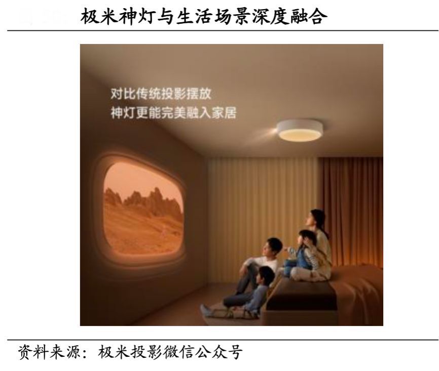 經(jīng)典案例:根據(jù)極米投影微信公眾號(hào)、國海證券研究所等綜合資訊表明,極米科技全新形態(tài)投影儀“極米神燈”2022 年 8 月進(jìn)入國內(nèi)市場,集吸頂燈、 投影儀、音響于一體,配合推出無線 HDMI 同屏器,解決了傳輸不便、光線易遮 擋和射眼等問題。