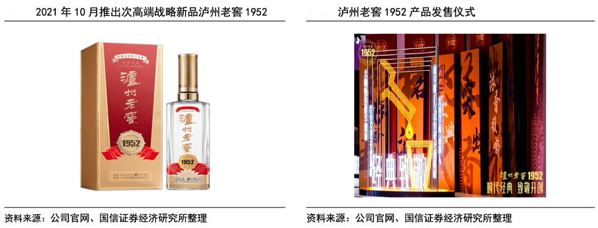 經(jīng)典案例:根據(jù)公司官網(wǎng)、國信證券經(jīng)濟(jì)研究所等綜合資訊表明,2021年10 月瀘州老窖公司推出次高端戰(zhàn)略新品瀘州老窖 1952(52 度 500ml),建議零售價(jià) 899 元,一方面意在補(bǔ)充布局 600-800 元價(jià)格帶,完善產(chǎn)品矩陣,與低度老窖共同加碼次高端市場;另一方面也是瀘州老窖品牌復(fù)興的重要一環(huán),希望借此產(chǎn)品拉升瀘州老窖品牌的形象。新品名稱寓意致敬 1952 年瀘州老窖在全國第一屆評(píng)酒會(huì)上奪得“四大名酒”稱號(hào),被譽(yù)為濃香酒的典型代表、酒中泰斗。