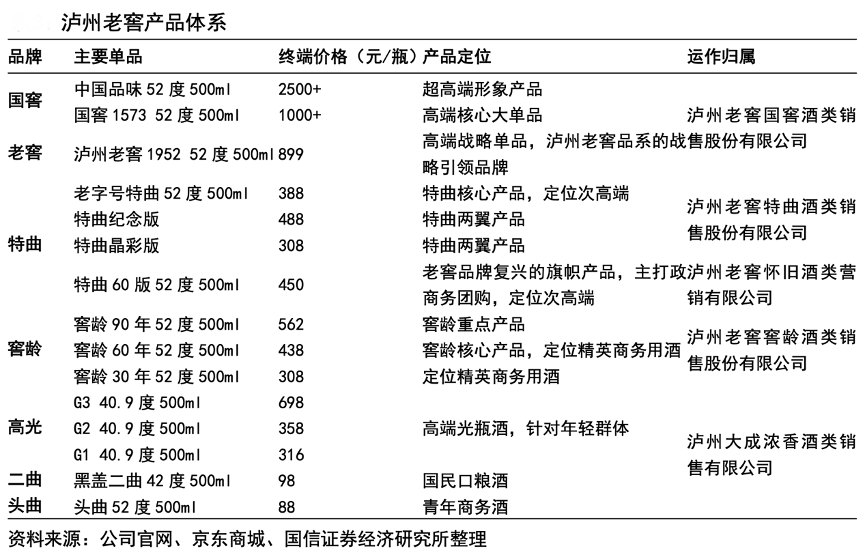 經(jīng)典案例:根據(jù)公司官網(wǎng)、京東商城和國信證券經(jīng)濟(jì)研究所等綜合資訊表明,2018年瀘州老窖公司確立“雙品牌、三品系、大單品”全價(jià)格帶覆蓋的品牌戰(zhàn)略,其中“雙品牌”即國窖 1573 和瀘州老窖,“三品系”即高中低檔,“大單品”包括國窖1573、特曲、窖齡、頭曲、二曲,以及近兩年推出的戰(zhàn)略新品瀘州老窖 1952 和高光。