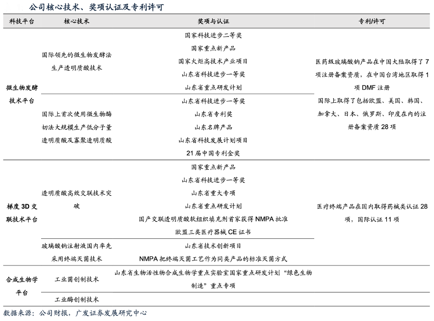 經(jīng)典案例:根據(jù)公司財報、廣發(fā)證券發(fā)展研究中心等綜合資訊表明,華熙生物公司憑借六大研發(fā)平臺實現(xiàn)了多項技術(shù)突破,獲得多項國家級、省部級獎項,并逐步將產(chǎn)品類型由透明質(zhì)酸原料延伸至多類產(chǎn)品應(yīng)用,覆蓋了透明質(zhì)酸原料至相關(guān)終端產(chǎn)品的完整產(chǎn)業(yè)鏈。截至2022年6月 30日,公司已申請專利570項,其中已獲授權(quán)專利226項。