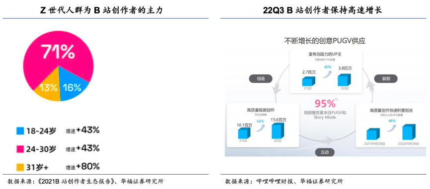 經(jīng)典案例:根據(jù)《2021 B站創(chuàng)作者生態(tài)報(bào)告》、嗶哩嗶哩財(cái)報(bào)、華福證券研究所等綜合資訊表明,B 站去中心化的流量分發(fā)機(jī)制吸引了更多的創(chuàng)作者加入 B 站。22Q3,B 站萬粉以 上的創(chuàng)作者數(shù)量同比增長(zhǎng) 48%,月均活躍UP 主數(shù)量達(dá) 380 萬,同比增長(zhǎng) 40%。2021 年 B 站創(chuàng)作者優(yōu)質(zhì)內(nèi)容獲得《人民日 報(bào)》《光明日?qǐng)?bào)》等主流媒體轉(zhuǎn)發(fā) 26730 次,24-30 歲的 Z 世代人群是 B 站創(chuàng)作者的主力,占到71%,這些受過良好教育、富有創(chuàng)造力的青年UP 主群體為 B 站提供了優(yōu)質(zhì)的 PUGV 內(nèi)容,同時(shí)這些內(nèi)容受到主流媒體的認(rèn)可。