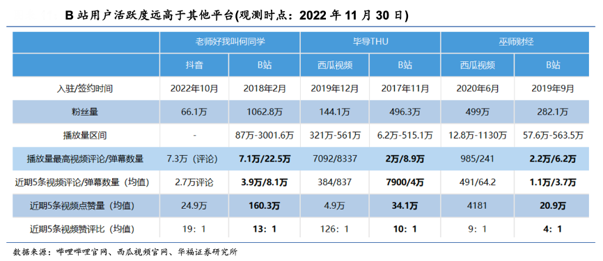經(jīng)典案例:根據(jù)嗶哩嗶哩官網(wǎng)、西瓜視頻官網(wǎng)、華福證券研究所等綜合資訊表明,B站粉絲的強(qiáng)互動(dòng)屬性。從三大創(chuàng)作者粉絲在 B 站和西瓜視頻或抖音的表現(xiàn)對(duì)比來看,何同學(xué)和畢導(dǎo) B 站的粉絲量及活躍度均遠(yuǎn)超其他平臺(tái),而巫師財(cái)經(jīng)雖然在 B 站上的粉絲體量小但其活躍度高,粉絲更具價(jià)值。