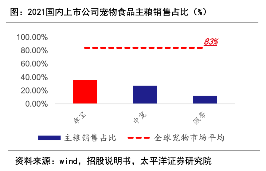 經(jīng)典案例:根據(jù)wind、招股說明書、太平洋證券研究院等綜合資訊表明,主糧產(chǎn)品毛利高,標(biāo)準(zhǔn)化生產(chǎn),是寵物食品的主要消費品,全球?qū)櫸锸称分骷Z平均消費額占比83%,乖寶主糧銷售占比36%高于中寵27%,佩蒂12%,搶占國內(nèi)未來寵物食品市場主糧制高點,占據(jù)先發(fā)優(yōu)勢。