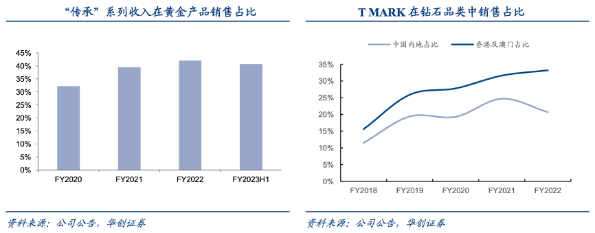 經(jīng)典案例:根據(jù)公司公告、華創(chuàng)證券等綜合資訊表明,周大福注重產(chǎn)品創(chuàng)新,傳承及人生四美等系列產(chǎn)品頻出,繁復(fù)工藝與精巧設(shè)計(jì)彰顯品牌匠心,一方面產(chǎn)品差異化優(yōu)勢(shì)凸顯,另一方面新品亦成為主力產(chǎn)品,傳承系列在黃金產(chǎn)品收入中占比已超四成。