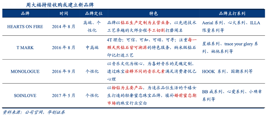經(jīng)典案例:根據(jù)公司官網(wǎng)、華創(chuàng)證券等綜合資訊表明,自 2014 年開(kāi)始,周大福逐步創(chuàng)立新品牌,構(gòu)建品牌矩陣。隨著顧客需求漸趨于個(gè)性化及多元化,公司緊接推出以音樂(lè)為創(chuàng)作靈感的 MONOLOGUE、為千禧女生設(shè)計(jì)的輕奢蜜戀珠寶 SOINLOVE、和主打彩色珠寶的 ENZO。目前品牌矩陣已經(jīng)成型,可進(jìn)一步吸引各類(lèi)消費(fèi)者,打開(kāi)千禧代市場(chǎng)。