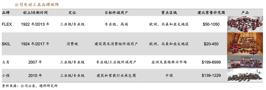 經(jīng)典案例:根據(jù)公司公告、德邦研究所等綜合資訊表明,泉峰公司目前擁有 FLEX、SKIL、大有、小強(qiáng)四個(gè)電動工具品牌,其中 FLEX、大有、 小強(qiáng)專注于專業(yè)級/工業(yè)級產(chǎn)品,SKIL 專注于消費(fèi)級電動工具。公司 2007 年、2010 年推出大有、小強(qiáng)電動工具自有品牌,分別針對高端專業(yè)以及建材家居裝修市場; 2013 年收購 FLEX、2017 年收購 SKIL,重點(diǎn)突破北美歐洲等海外市場。