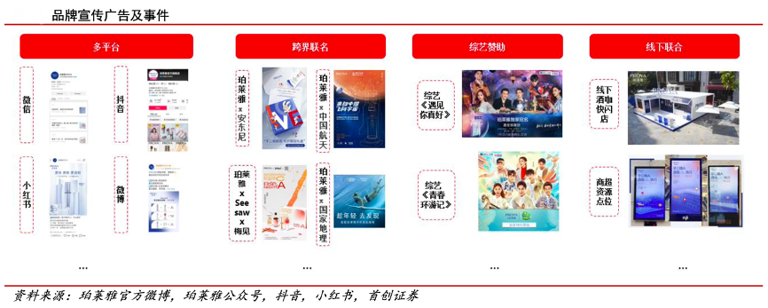 經(jīng)典案例:根據(jù)珀萊雅官方微博、珀萊雅公眾號、抖音、小紅書、首創(chuàng)證券等綜合資訊表明,珀萊雅以 20-35 歲的女性群體為中心,將品牌植入生活,落實大單品的宣傳,實現(xiàn)在多平臺、跨界聯(lián)名、綜藝贊助、線下聯(lián)合等多元渠道的共同發(fā)力,與人氣作者安東尼、中國航天、國家地理、梅見、SeeSaw 等均有 聯(lián)名合作,共同實現(xiàn)知名度提升。根據(jù) 22 年雙十一戰(zhàn)報,品牌多地快閃店的開設(shè)已實現(xiàn)累計人流量超 130 萬人次,同時線下梯媒硬廣曝光量超 7000 萬。