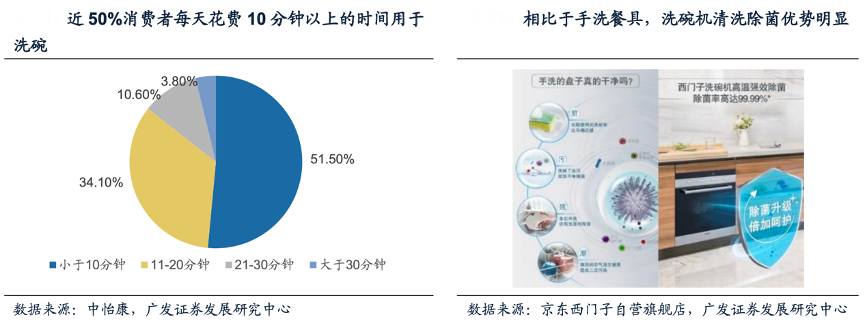經(jīng)典案例:根據(jù)中怡康、京東西門子自營旗艦店、廣發(fā)證券發(fā)展研究中心等綜合資訊表明,結(jié)合中怡康數(shù)據(jù),接近50%的消費者每天花費10分鐘以上的時間洗碗,而洗碗機解決了洗碗費時費力的痛點,用戶一鍵便可完成洗碗工作。同時相比于用抹布手洗,洗碗機能夠有效地徹底去除餐具上殘油的油膩,還能利用高溫環(huán)境有效殺死大腸桿菌等常見病毒病菌,除菌率高達99.99%。