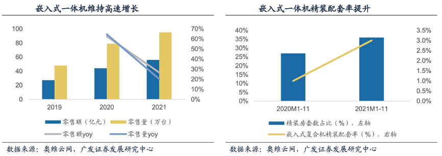 經(jīng)典案例:根據(jù)奧維云網(wǎng)、廣發(fā)證券發(fā)展研究中心等綜合資訊表明,蒸烤一體機市場快速發(fā)展,精裝房配套率提升。以嵌入式蒸烤一體機為例,市場規(guī) 模保持高速增長。奧維云網(wǎng)數(shù)據(jù)顯示,零售渠道,嵌入式蒸烤一體機近兩年銷額、銷量復(fù)合增速分別達到43.5%、40.7%,2021全年銷售額達到56億元,同比增長26.7%; 銷量達到95萬臺,同比增長20.3%。