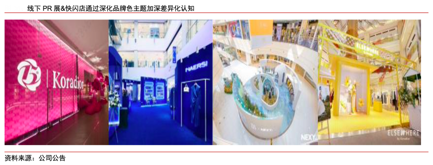 經(jīng)典案例:根據(jù)公司公告、中信證券研究部等綜合資訊表明,贏家時(shí)尚將品牌色、品牌花融入產(chǎn)品設(shè)計(jì)及線下?tīng)I(yíng)銷,加深差異化認(rèn)知。以三大核心品牌為例,其賦予各品牌代表色,例如珂萊蒂爾玫紅、娜爾思 25 度藍(lán)、奈蔻綠、珂思黃,并在產(chǎn)品設(shè)計(jì)上融入玫瑰、百合、蘭花等品牌花賦予品牌差異化內(nèi)涵,結(jié)合線下場(chǎng)景深度植入,對(duì)各大品牌做清晰區(qū)分,打造差異化認(rèn)知。