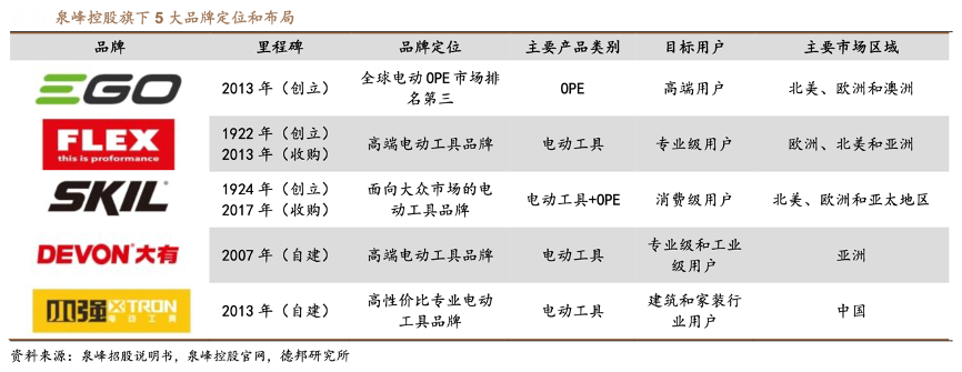 經(jīng)典案例:根據(jù)泉峰招股說明書、泉峰控股官網(wǎng)、德邦研究所等綜合資訊表明,泉峰公司已經(jīng)建立了多樣化的品牌組合,不同品牌覆蓋不同的市場區(qū)域以及定位具有差異,能夠滿足世界各地終端用戶的多樣化需求。其中OPE 產(chǎn)品品牌 EGO 市場規(guī)模復(fù)合增速最快,由 18 年的 1.75 億美元提升至 20 年的 4.59 億元,占公司收入比重由25.3%迅速提升至 21H1 的 39.3%。