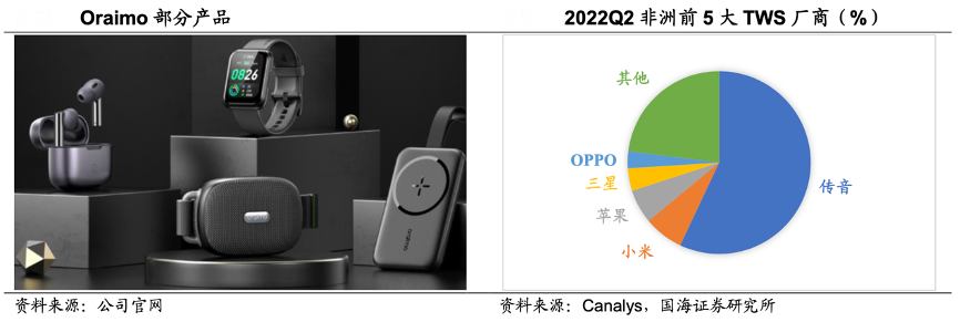 經(jīng)典案例:根據(jù)公司官網(wǎng)、Canalys、國海證券研究所等綜合資訊表明,傳音公司 3C 匹配件品牌 oraimo,定位為新興市場高端知名音頻品牌。產(chǎn)品類型涵 蓋 TWS 和 Open audio、音箱和有線耳機四個大品類,其中 TWS 方向為品牌主 攻。品牌專注于為全球年輕消費者打造酷炫的、獨具創(chuàng)意的智能配件產(chǎn)品,現(xiàn)已成為非洲最受消費者歡迎的 3C 配件品牌之一,截至 2022 年 9 月,已成功覆蓋 非洲、南亞,東南亞,拉美等 50 多個國家和地區(qū),用戶規(guī)模超 1 億。