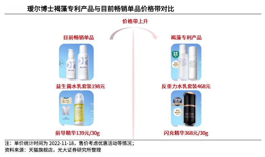 經(jīng)典案例:根據(jù)天貓旗艦店、光大證券研究所等綜合資訊表明,以璦爾博士為例,早期品牌推出益生菌水乳、益生菌面膜等產(chǎn)品將微生態(tài)護(hù)膚概念推廣出來。2021 年其推出抗初老方向的國家專利成分“益生菌發(fā)酵褐藻”,創(chuàng)新性地采取雙菌二次發(fā)酵技術(shù),目前旗下產(chǎn)品反重力水乳套裝以及閃充精華均搭載褐藻專利技術(shù),定價(jià)分別為468元、368元,相較此前推出的益生菌水乳套裝(198 元)以及前導(dǎo)精華(139 元) 價(jià)格帶實(shí)現(xiàn)上移。