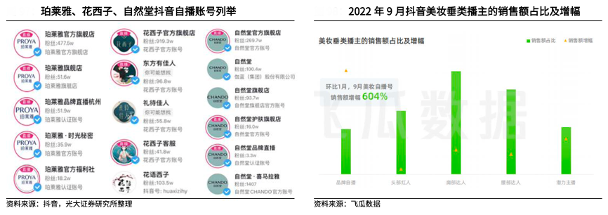 經(jīng)典案例:根據(jù)抖音、飛瓜數(shù)據(jù)、光大證券研究所等綜合資訊表明,以珀萊雅為例,截至 2022 年 6 月末,珀萊雅抖音自播和達(dá)播的銷售占比為 6:4。目 前珀萊雅在抖音設(shè)有 7 個(gè)賬號,其中“珀萊雅官方旗艦店”粉絲數(shù)量最多、達(dá) 478 萬,其余賬號粉絲量均在 100 萬以下。