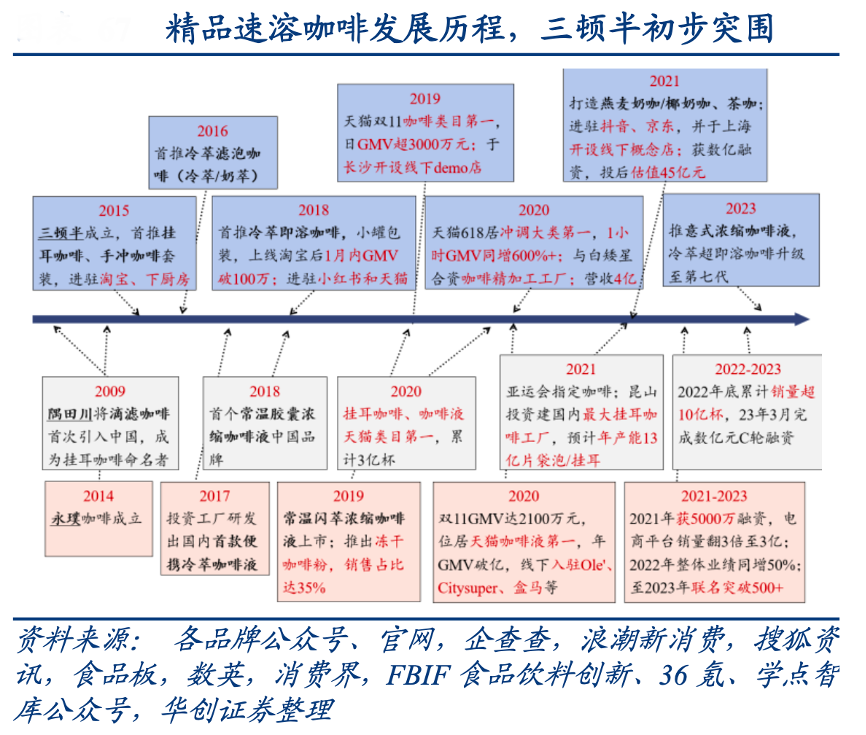 經(jīng)典案例:根據(jù)各品牌公眾號(hào)、官網(wǎng)、企查查、浪潮新消費(fèi)、搜狐資訊、食品板、數(shù)英、消費(fèi)界、FBIF食品飲料創(chuàng)新、36氪、學(xué)點(diǎn)智庫公眾號(hào)、華創(chuàng)證券等綜合資訊表明,三頓半創(chuàng)立于 2015 年,但此前創(chuàng)始人已有 7 年咖啡館從業(yè)經(jīng)驗(yàn),推出“小罐子即溶咖啡”后迅速走紅全網(wǎng),成為速溶行業(yè)第二,可以說是精品咖啡代表。