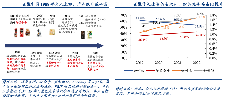經(jīng)典案例:根據(jù)雀巢官網(wǎng)、公眾號(hào)、藍(lán)鯨財(cái)經(jīng)、Foodaily每日食品、第十屆中國國家飲料工業(yè)科技展、FBIF食品飲料創(chuàng)新公眾號(hào)、歐睿、華創(chuàng)證券等綜合資訊表明,近年來中國咖啡市場(chǎng)高速增長,近年來雀巢 1+2 傳統(tǒng)速溶基本穩(wěn)定,咖啡液和膠囊貢獻(xiàn)主要增量,公司也積極加碼精品 咖啡,自 2018 年收購星巴克零售咖啡業(yè)務(wù)后,現(xiàn)已培育濃縮咖啡、袋泡咖啡、冷萃咖啡液、冷萃凍干粉全產(chǎn)品矩陣,甚至在線上布局膠囊咖啡機(jī)。