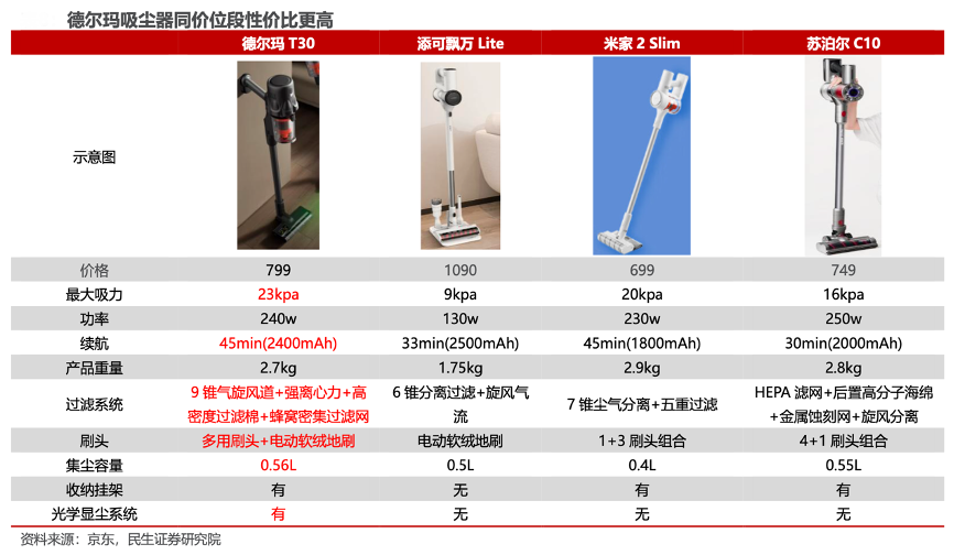 經(jīng)典案例:根據(jù)京東、民生證券研究院等綜合資訊表明,以京東商城同價位段的競爭對手產(chǎn)品對比發(fā)現(xiàn),以德爾瑪 T30 為例,該吸塵器在多項性能指標上處于領先地位,其最大吸力、續(xù)航能力、集塵容量等均優(yōu)于米家和蘇泊爾的同價位段產(chǎn)品,并裝有綠光顯塵系統(tǒng),地板微塵可視化,9 錐氣旋風道+強離心 力+高密度過濾棉+蜂窩密集過濾網(wǎng)超強過濾,可過濾 0.3μm 以下微塵,濾塵率高達 99.7%。