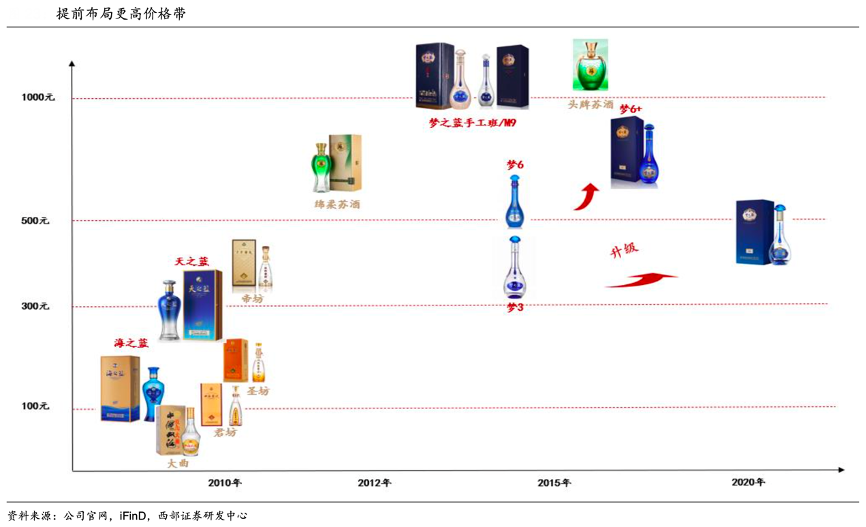 經(jīng)典案例:根據(jù)公司官網(wǎng)、iFinD、西部證券研發(fā)中心等綜合資訊表明,洋河敏銳把握消費(fèi)升級(jí)趨勢,提前卡位機(jī)會(huì)價(jià)格帶,如2003年在省內(nèi)主流消費(fèi)在 80 元左右時(shí)創(chuàng)新性推出百元海之藍(lán),成功放量引領(lǐng)升級(jí),后續(xù)切換天之藍(lán)接力高增,在調(diào)整期亦持續(xù)向上發(fā)力培育夢之藍(lán),2019年戰(zhàn)略聚焦打造夢 6+, 精準(zhǔn)卡位相對空白的 600-800 元價(jià)格帶,與次高端主流價(jià)格帶錯(cuò)位競爭,并為中腰部品牌留足升級(jí)空間。