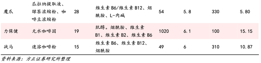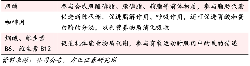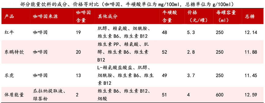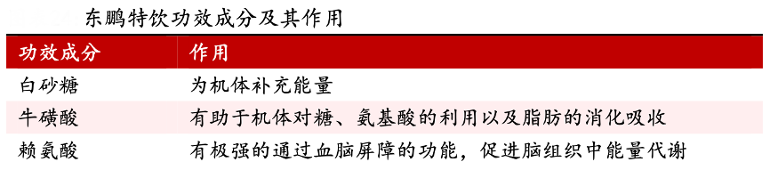 經(jīng)典案例:根據(jù)公司公告、方正證券研究所等綜合資訊表明,東鵬特飲富含牛磺酸、賴(lài)氨酸、多種 B 族維生素和其他營(yíng) 養(yǎng)成分,并添加藥品級(jí)咖啡因,其中,?;撬岜Wo(hù)心肌,煙酸、B6、B12 對(duì)能量 代謝有加速和刺激作用,咖啡因促使思維變得敏捷清晰、減少疲勞,賴(lài)氨酸提高人體注意力,形成一個(gè)完整的抗疲勞體系。