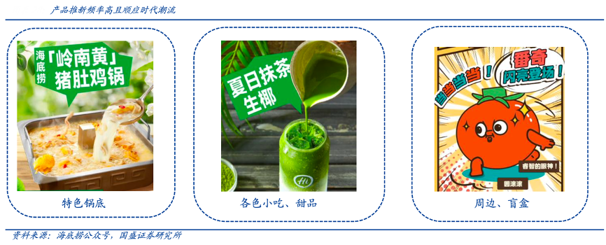 經(jīng)典案例:根據(jù)海底撈公眾號、國盛證券研究所等綜合資訊表明,海底撈 的推新頻率頗高,在菜品創(chuàng)新及融合上做到極具特色,同時迎合當代年輕人喜好,推出網(wǎng)紅產(chǎn)品,每次推出新品都能在各大網(wǎng)絡(luò)平臺掀起一股潮流。同時海底撈會根據(jù)不同地區(qū)飲食習慣推出地區(qū)特定菜單,除官網(wǎng)上公布的經(jīng)典鍋底外,還有如廣州海南地區(qū)的牛肉湯鍋底、青椒鍋底、參鮑雞金湯鍋;天津、山東地區(qū)的雞湯豆花鍋底等。
