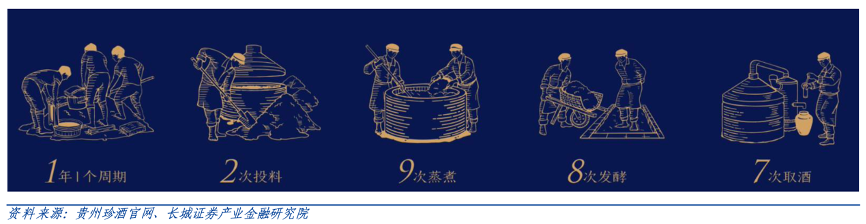經(jīng)典案例:根據(jù)貴州珍酒官網(wǎng)、長(zhǎng)城證券產(chǎn)業(yè)金融研究院等綜合資訊表明,在釀造工藝 方面,珍酒堅(jiān)守傳統(tǒng)大曲醬香釀造工藝和流程,約 11 個(gè)月一個(gè)周期,2 次投料,端午制曲,重陽下沙,9 次蒸煮,8 次發(fā)酵,7 次取酒,長(zhǎng)期珍藏。一瓶珍酒的誕生,從釀造到 出廠銷售,至少要經(jīng)過 5 年以上時(shí)光與歲月的沉淀。