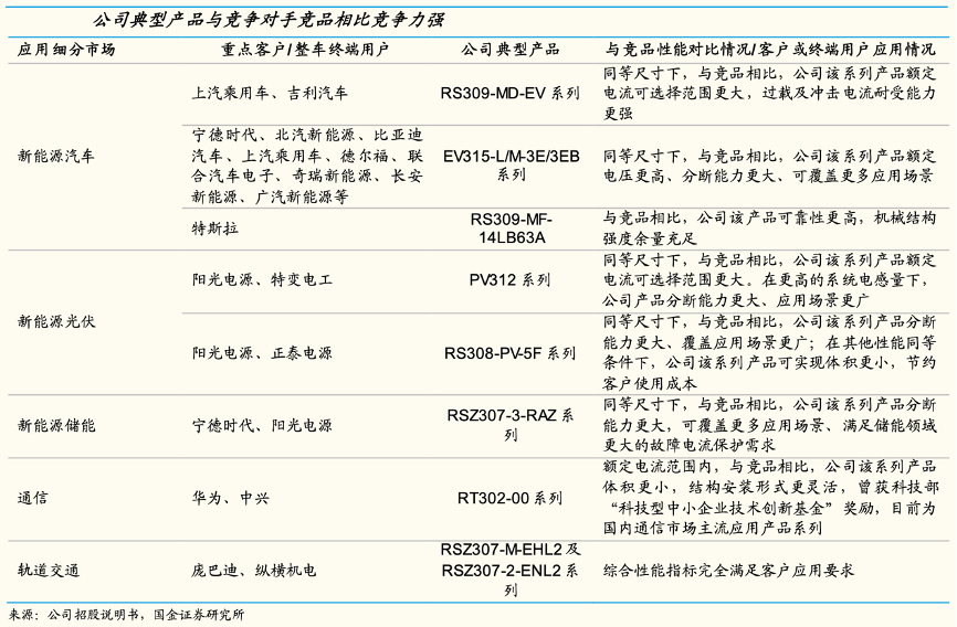 經(jīng)典案例:根據(jù)公司招股說明書、國金證券研究所等綜合資訊表明,與競品相比,中熔電氣公司各個細(xì)分市場產(chǎn)品具有顯著比較優(yōu)勢。應(yīng)用于新能源汽車的 RS309-MD-EV 系列產(chǎn)品額定電流 600-900A、額定電流可選擇范圍更大;應(yīng)用于新能源儲能的 RSZ307-3-RAZ 系列產(chǎn) 品額定分?jǐn)嗄芰蛇_ 250kA、動作時間低于 5ms,額定電壓可達 DC1500V,可實現(xiàn)更強的分?jǐn)嗄芰Α?yīng)用場景更廣泛。