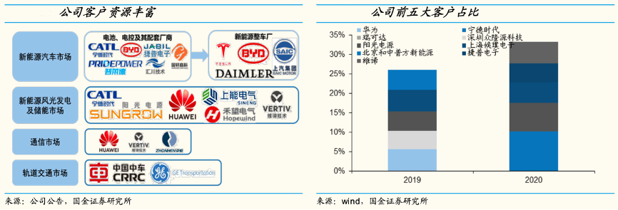 經(jīng)典案例:根據(jù)公司公告、wind、國金證券研究所等綜合資訊表明,憑借自身優(yōu)勢,中熔電氣公司在各個領(lǐng)域積累了優(yōu)質(zhì)客戶群。在新能源市場,公司熔斷器產(chǎn)品通過寧德時代、比亞迪供應(yīng)鏈、捷普電子等主流動力電池、電控系統(tǒng)及配套廠商切入新能源汽車供應(yīng)鏈,終端用戶有特斯拉、比亞迪、上汽乘用車等國內(nèi)外主流新能源整車廠。2020 年公司前五大客戶占比 33%,寧德時代、陽光電源分別為公司貢獻營收 0.23、0.17 億元,合計占據(jù)18%的份額。