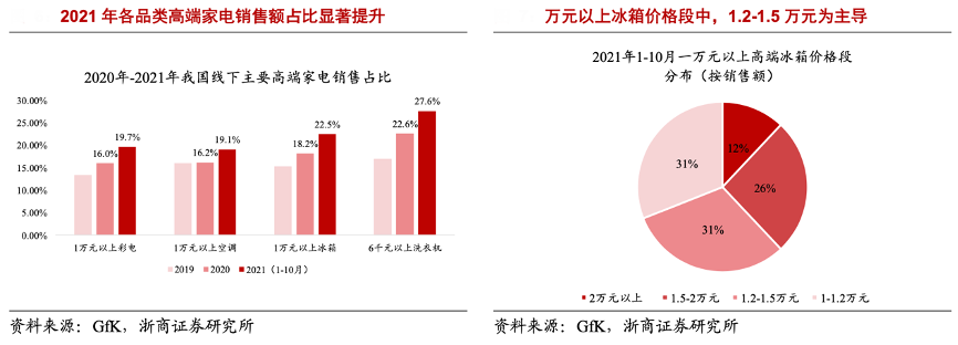 經(jīng)典案例:根據(jù)Gfk、浙商證券研究所等綜合資訊表明,家電高端化趨勢持續(xù),高端產(chǎn)品占比提升。1)根據(jù)GfK 數(shù)據(jù),2021 年 1-10 月萬元以上 冰箱、6000 元以上洗衣機(jī)、萬元以上空調(diào)、萬元以上彩電零售額占比分別為 22.5%、27.6%、 19.1%、19.7%,2019-2021 年高端產(chǎn)品占比持續(xù)提升。2)從產(chǎn)品功能結(jié)構(gòu)上看,冰箱趨向大容量、洗衣機(jī)趨向大容積、空調(diào)趨向新風(fēng)功能的消費(fèi)趨勢。以冰箱為例,22W1-12 期間多門和對開門冰箱線上、線下零售額份額分別為 71.3%、84.5%,分別同比提升2.7 pct、1.6 pct。