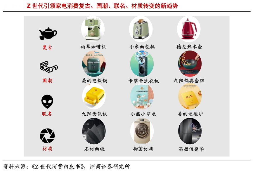 經(jīng)典案例:根據(jù)《Z世代消費(fèi)白皮書》、浙商證券研究所等綜合資訊表明,從外觀上看,家電藝術(shù)凸顯審美提升消費(fèi)幸福感,顏色和材質(zhì)都發(fā)生了變化。例如卡薩帝冰箱推出原石高定系列,采用石材 面板,首發(fā)價(jià)格達(dá)到15000 元;三星推出 The Frame 畫壁系列電視,其效果為開啟時(shí)是一臺電視機(jī),關(guān)閉時(shí)是畫框,75 英寸售價(jià)為1.8 萬元。