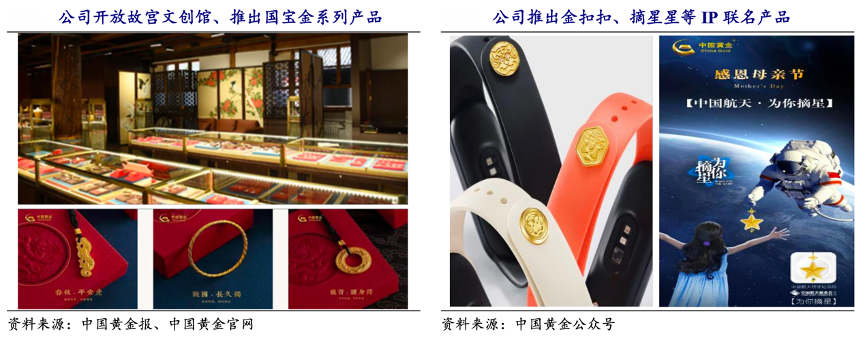 經(jīng)典案例:根據(jù)中國黃金報、中國黃金公眾號、中國黃金官網(wǎng)、開源證券研究所等綜合資訊表明,近年來國潮消費在年輕一代中興起,中國黃金精準(zhǔn)定位年輕消費群體,2022 年 3 月,中國黃金故宮文創(chuàng)館正式開放,作為重要的文創(chuàng)產(chǎn)品展銷、文化傳播平臺,豐富了公司金飾產(chǎn)品的內(nèi)涵與表現(xiàn)手法,滿足人們對時尚、個性、設(shè)計感強的文化類黃金飾品需要。此外,公司還推出 IP 聯(lián)名產(chǎn)品,如與小米有品聯(lián)名推出金 扣扣、與中國航天基金會聯(lián)名推出摘星星系列產(chǎn)品等,不斷拓寬產(chǎn)品矩陣、開發(fā)高附加值產(chǎn)品,圈粉年輕消費群體。