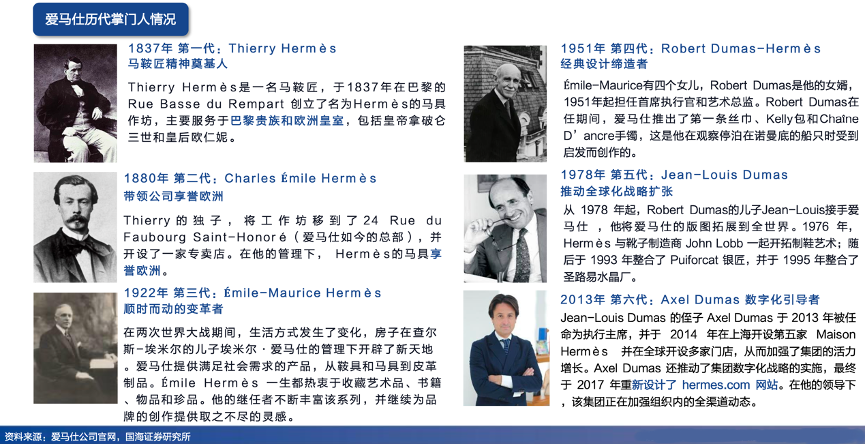 經(jīng)典案例:根據(jù)愛馬仕公司官網(wǎng)、國海證券研究所等綜合資訊表明,愛馬仕六代掌門人均來自愛馬仕家族。